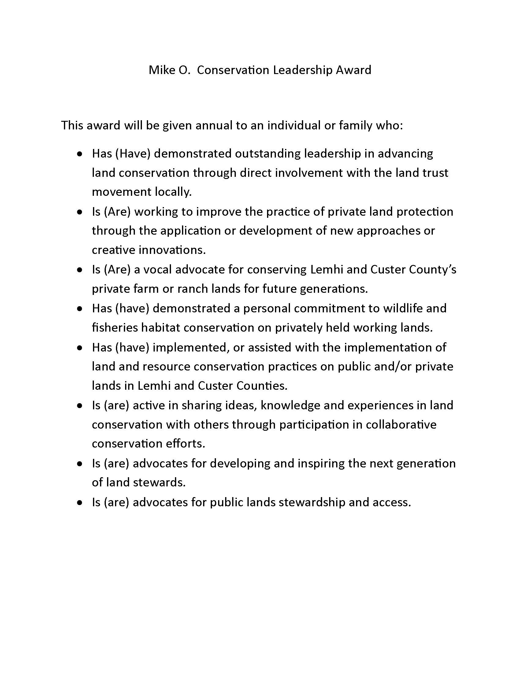 Nominees should embody the values Mike championed: a deep connection to the land, a passion for stewardship, and a commitment to inspiring future generations.